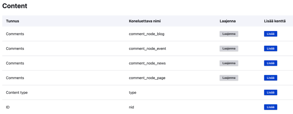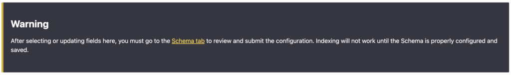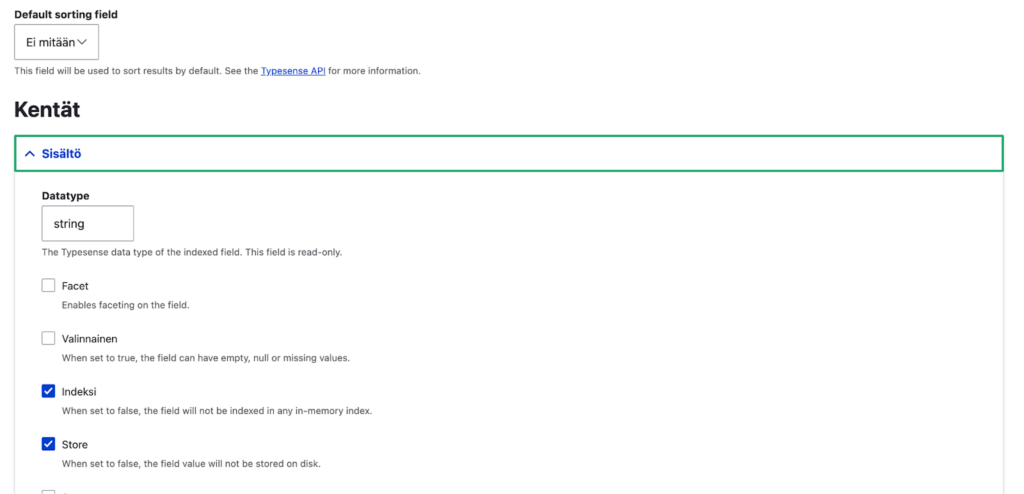 Schema tab -sivulla voit säätää jokaisen valitsemasi kentän asetuksia. Lähtökohtaisesti mitään ei tarvitse muuttaa, mutta esim. Facet tai Valinnainen voivat joskus olla tarpeen. Esim. tässä tapauksessa Sisältö-kenttää ei ole kaikissa valituissa sisältötyypeissä, joten sen kohdalla on valittava Valinnainen, jotta indeksointi menee läpi. Klikkaa lopuksi Tallenna.