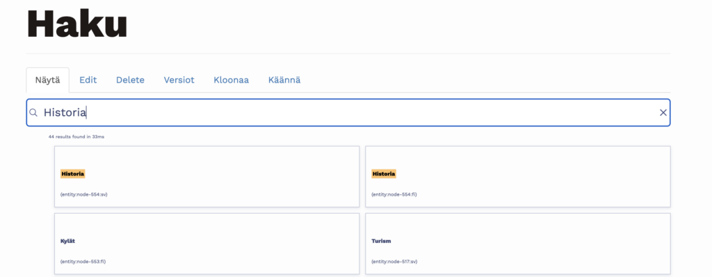 Tämän jälkeen voit lisätä TypeSense-haun sivuille modulin tarjoaman lohkon avulla. Sekä lohko että tulokset vaativat jonkin verran työstöä, jotta niistä saa kivan näköiset. Kuvassa ei ole nähty asian eteen juurikaan vaivaa, mutta sinä olet viitsivämpi ihminen ja pystyt siihen!
