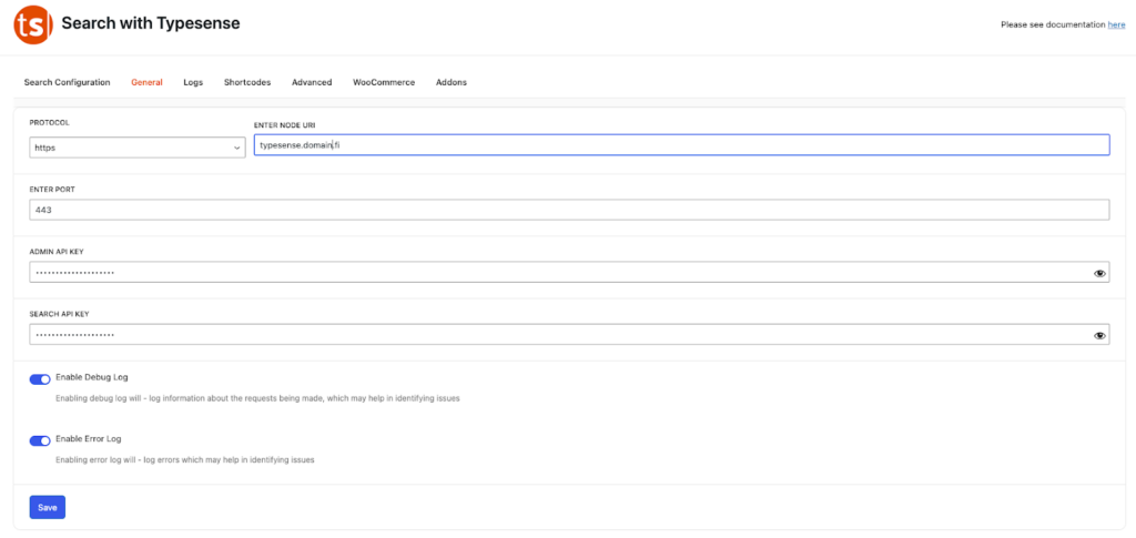 Seuraavaksi ladataan WordPress-plugin, joka huolehtii yhteydenotosta indeksiin. Löydät sen osoitteesta https://wordpress.org/plugins/search-with-typesense/ tai hakemalla WordPressin kautta. Tämän lisäksi, mikäli käytössä on WooCommerce, tarvitaan myös lisäosa sille: https://www.codemanas.com/downloads/typesense-search-for-woocommerce/. Tämä lisäosa on maksullinen, joten se pitää ostamisen jälkeen ladata itselleen ja sen jälkeen sivustolle.