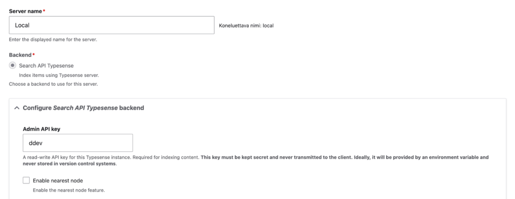 Määritä serverin nimi (voi olla mikä vaan, paitsi Localhost). Tässä tapauksessa TypeSense-serveri pyöri ddev-ympäristössä, joten API-key on ddev. Normaalisti tähän tulee ohjeissa aiemmin luotu API-avain.