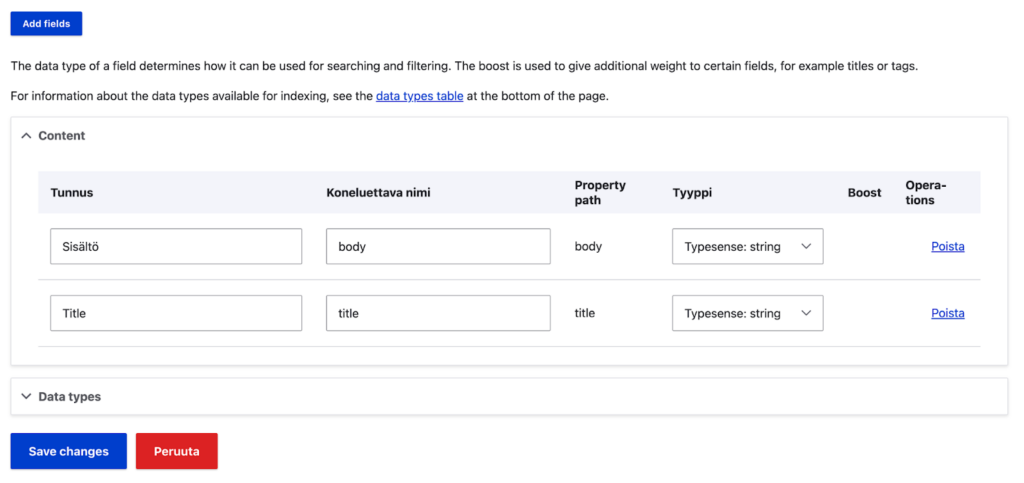Kun olet valinnut kentät, vaihda tyypiksi “Typesense:”-alkuinen versio datatyypistä. Klikkaa sitten Save changes.