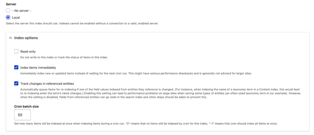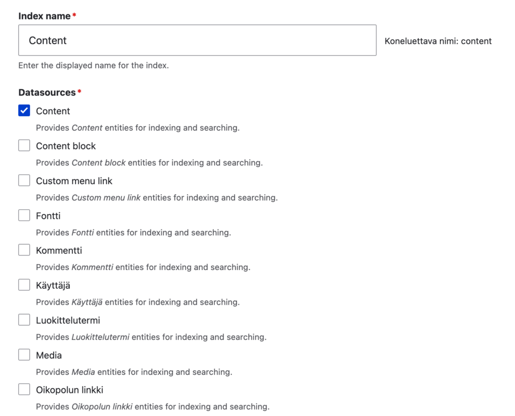 Indeksin nimi voi olla mikä vain. Valitse mitä kaikkea indeksiin tallennetaan. Yleensä Content riittää.