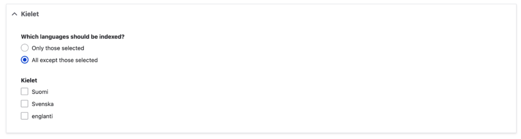 Valitse kaikki ne kentät (tai alakentät), jotka haluat mukaan indeksiin, ja tallenna.