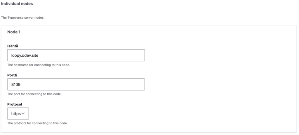 Tähän taas tiedot siitä, missä TypeSense-instanssi on, eli sama domain ja portti, jota containerin asetuksissa käytettiin aikaisemmin tässä ohjeessa. Huomaa, että Isäntä-kenttään ei pidä laittaa protokollaa, koska moduli lisää sen automaattisesti Public protocol -valinnan perusteella.
