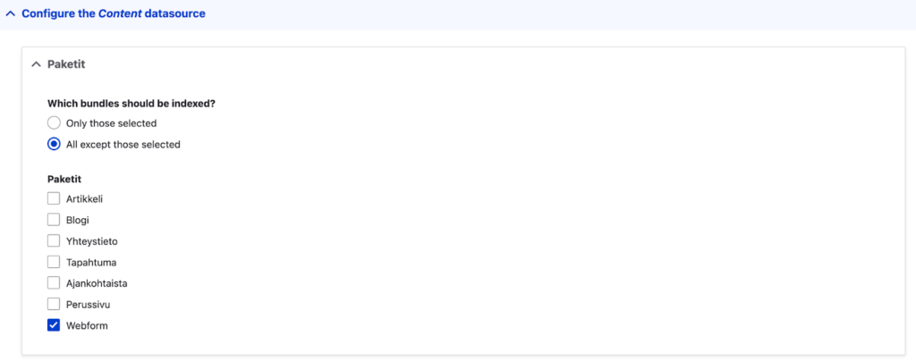 Kun valittuna on Content, valitaan vielä, mitkä sisältötyypit otetaan mukaan / jätetään pois.