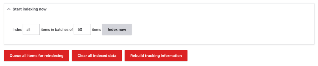 Kun yhteys on luotu, voit indeksoida. Esimerkissä on indeksoitu vain tuotteet, mutta voit indeksoida hakuun mitä tahansa saatavilla olevia sisältötyyppejä.