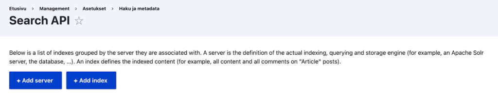 Palaa sitten sivulle Asetukset > Haku ja metadata > Search API ja klikkaa Add index.